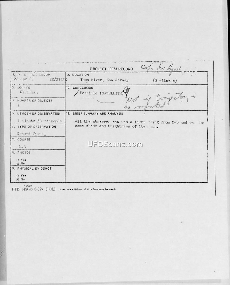 Project 10073 Record: UFO Observation, 23 April 1967, Toms River, New Jersey