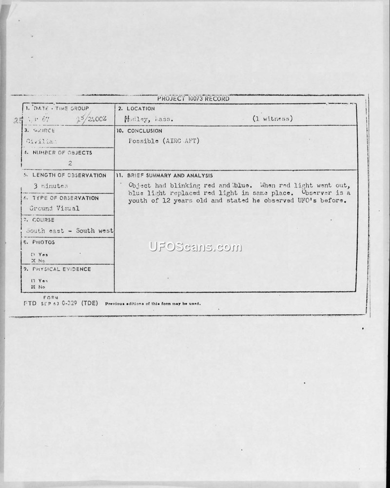 A 12-year-old witness in North Hadley, Massachusetts, reported observing two unidentified objects with blinking lights on April 25, 1967. The Air Force investigated the report under Project 10073, ultimately classifying the incident as a possible aircraft.