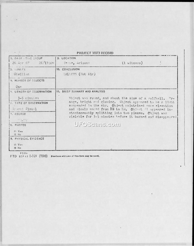 PROJECT 10073 RECORD - Sighting Report 26 April 1967, Tempe, Arizona