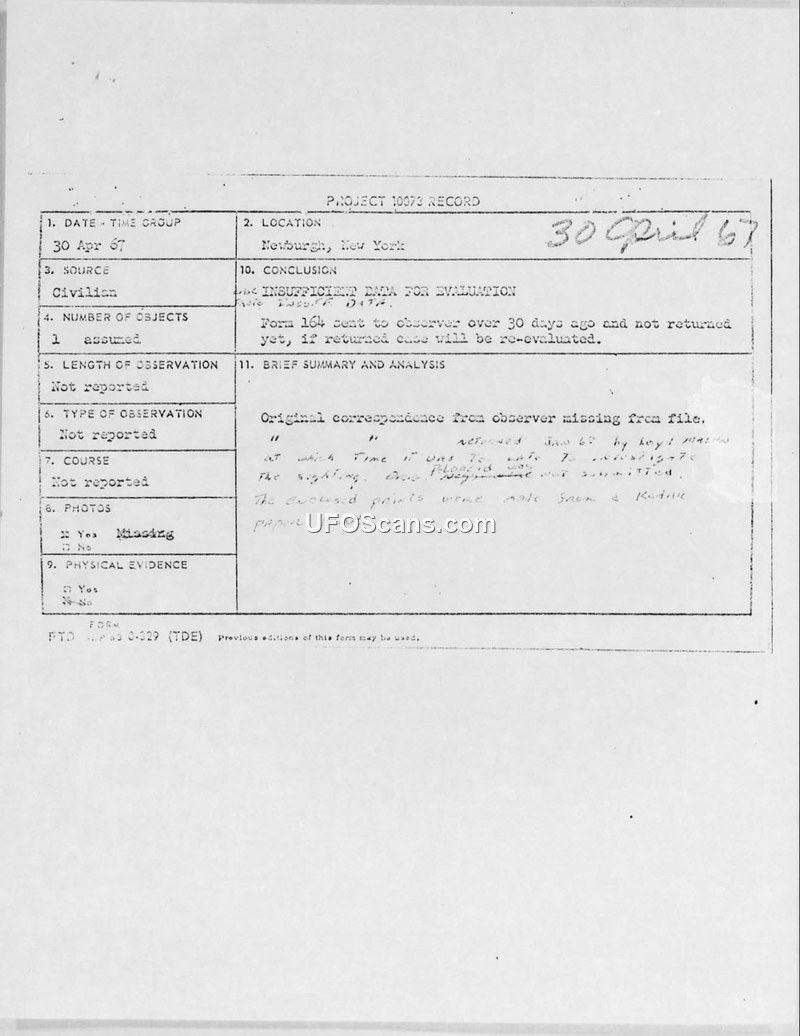 Project 10073 Record: UFO Observation and Photograph, 30 Apr 67