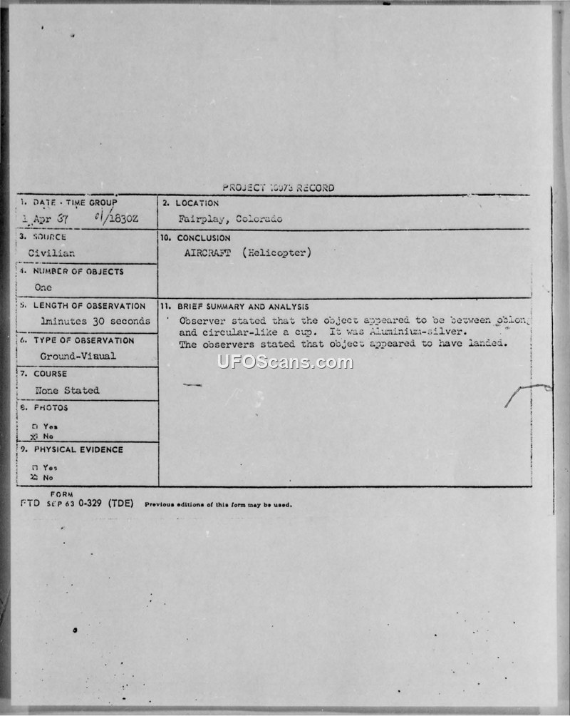 On April 1, 1967, at approximately 1830Z, a civilian observer reported a sighting of an unidentified aerial object near Kenosha Pass, Fairplay, Colorado. The observer, identified as a retired funeral director, noted the object while driving and stopped to observe it. The object was described as being between oblong and circular in shape, resembling a cup, and was aluminium-silver in color. The witness estimated the size to be equivalent to two or three car lengths and noted that it lacked windows, a cockpit, wings, or tails. The object was observed for approximately one minute and thirty seconds. According to the report, the object hovered before descending straight down behind a tree line, leading the observer to conclude that it had landed. The weather conditions were reported as clear with excellent visibility. The sighting was initially reported to Dr. Condon in Boulder, who referred the witness to the Lowry Command Post. The incident was also reported to State Patrolman Clan Wichman of Fairplay, Colorado, who attempted to approach the landing site but was prevented from doing so by snow. The official conclusion recorded in the Project 10073 document identifies the object as an aircraft, specifically a helicopter.