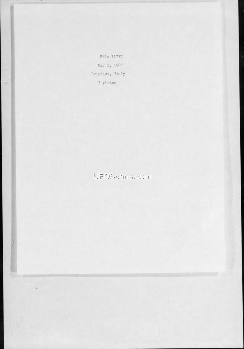 This document is a brief file record, identified as File 11737, concerning a sighting that occurred in Brindisi, Italy, on May 1, 1967. The file indicates that three photographs were associated with the report. The document is marked as unclassified and originates from the Foreign Technology Division of the Air Force Systems Command (AFSC). The visual content of the document includes three pages of photographic evidence, each showing a dark, disc-like object against a bright sky above a roofline. No further descriptive text, witness testimony, or official analysis is provided within the document.