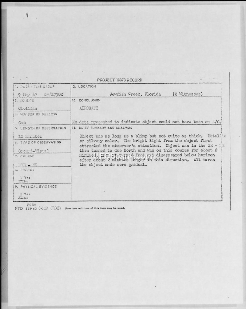 Project 10073 Record: Sighting at Jewfish Creek, Florida, 9 May 1967