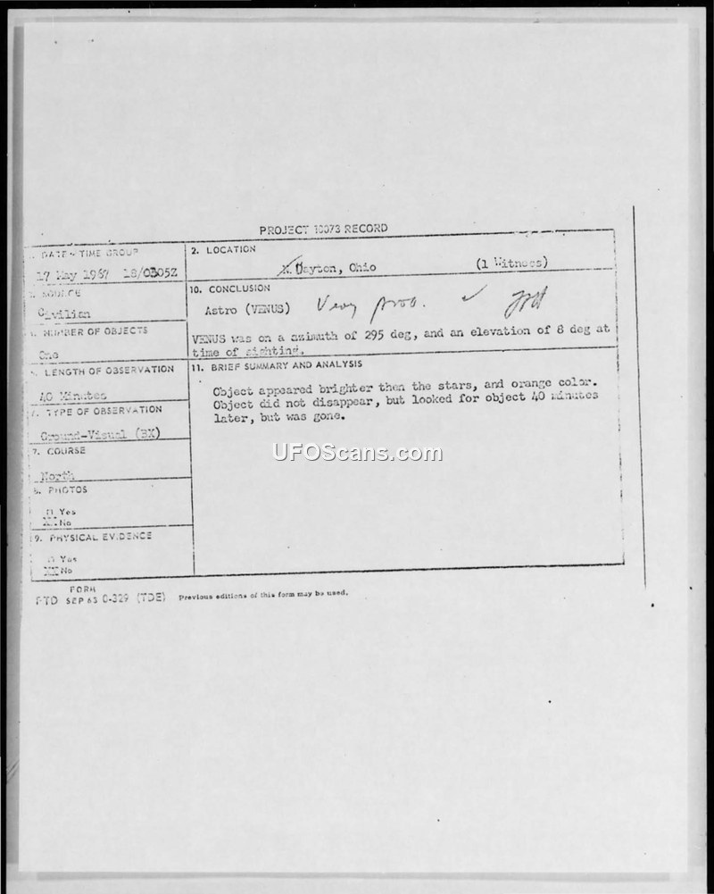 Multiple sightings in the Dayton, Ohio area were evaluated. Some were identified as Venus or the Moon, while others were considered possible aircraft given the proximity to Wright-Patterson AFB.