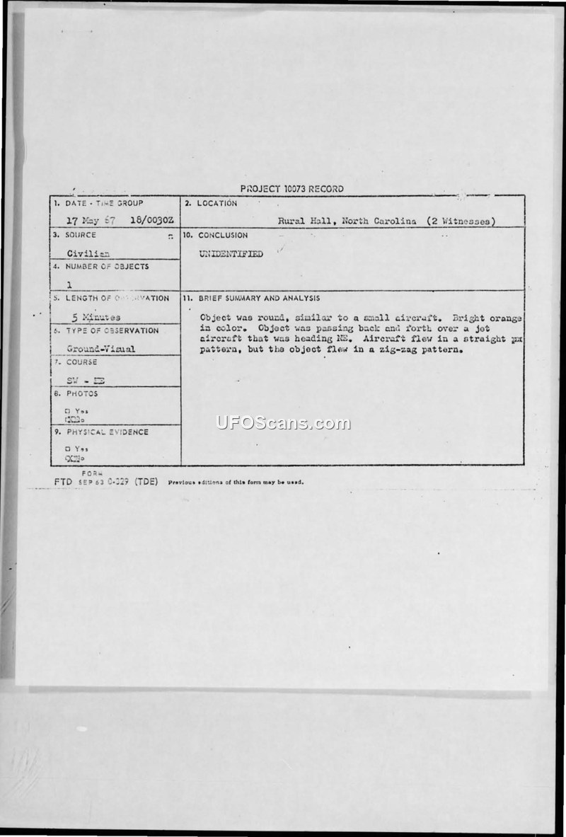 A bright orange, round object was observed performing zig-zag maneuvers over a jet aircraft in Rural Hall, North Carolina, on 17 May 1967. The Air Force investigated the incident under Project 10073 and ultimately classified it as 'UNIDENTIFIED'.