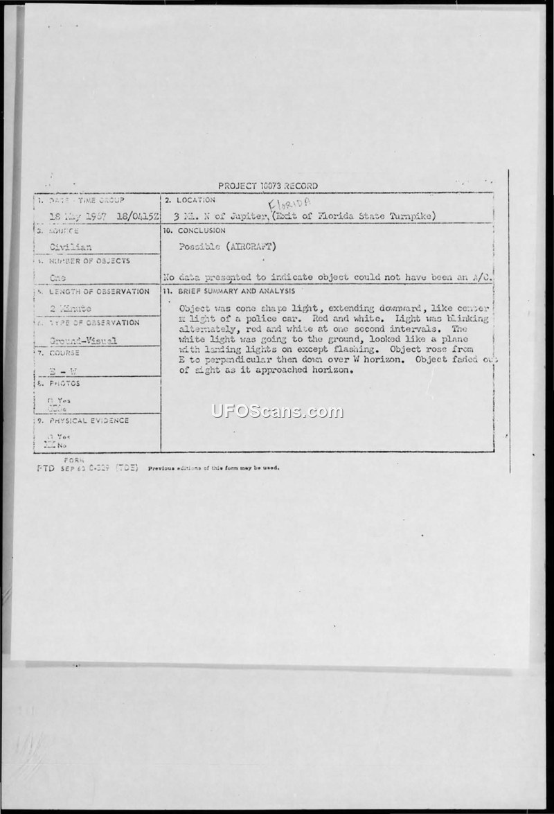 Project 10073 Record — Sighting near Jupiter, Florida, 18 May 1967