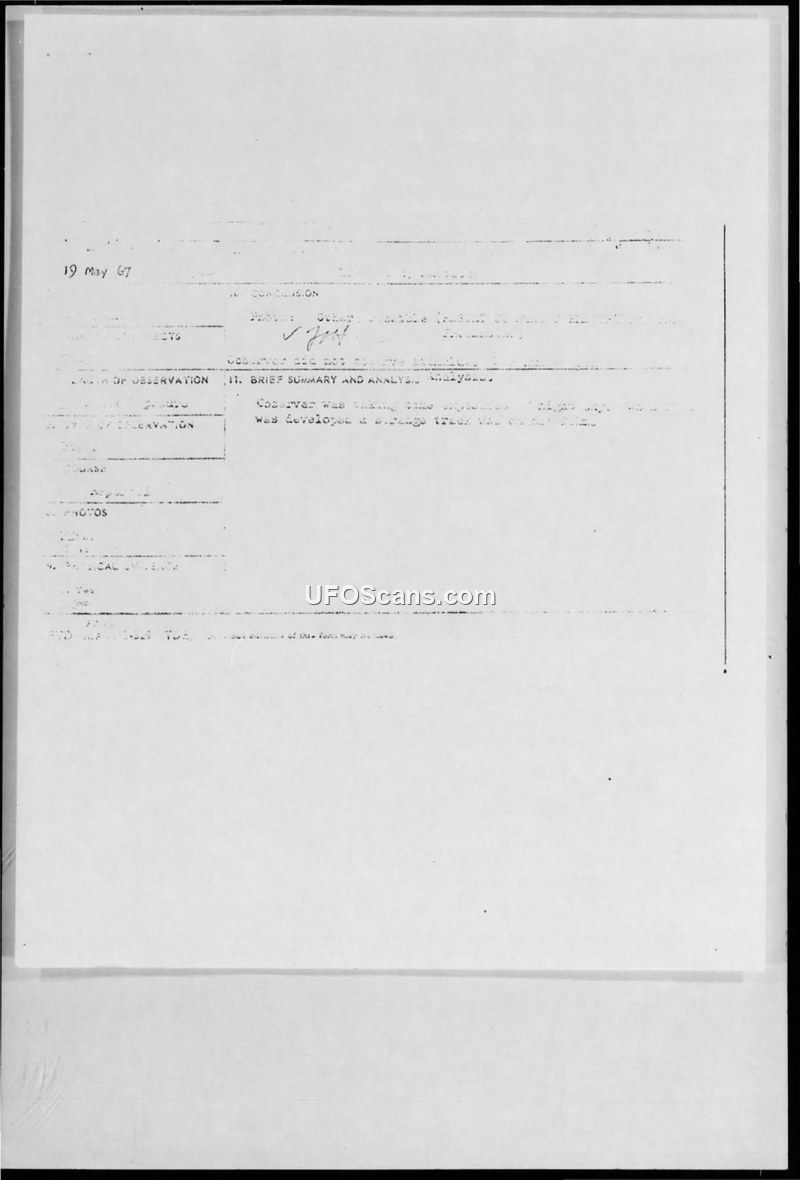 The submitted photography appears to be genuine as far as content is concerned; i.e. there is no indication of double exposure or retouching on either the negative or the resultant paper print. The condition of the negative is poor, having many scratches, finger prints etc. which rendered a comprehensive analysis virtually impossible. Although no definite configuration could be discerned as to the imagery, the possibility exists that it was a result of static electricity having occurred prior to processing.