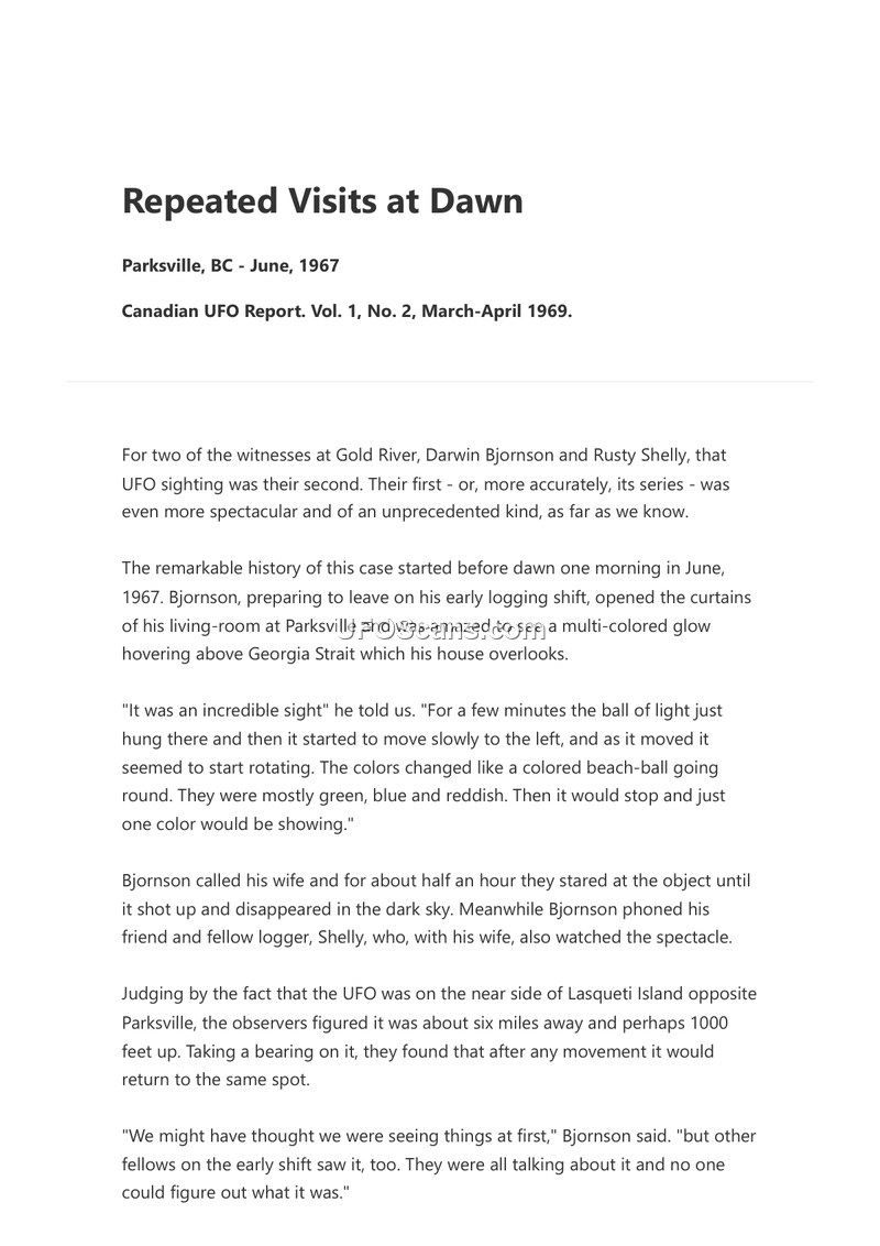 This article from the Canadian UFO Report describes repeated sightings of a multi-colored, hovering light over the Georgia Strait in Parksville, BC, during the summer of 1967. Multiple witnesses, including local loggers, observed the object on several occasions.