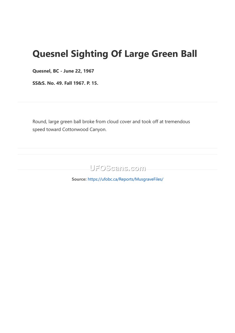 On June 22, 1967, an aerial phenomenon was observed in the vicinity of Quesnel, British Columbia. The object was described as a large, round, green ball. According to the report, the object emerged from cloud cover and proceeded to move at a tremendous speed in the direction of Cottonwood Canyon. This account is documented in the SS&S series, specifically in the Fall 1967 issue, page 15.