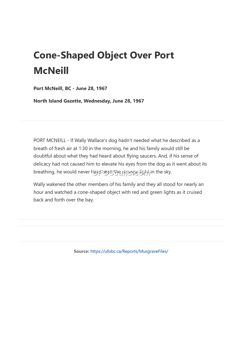 On the morning of June 28, 1967, a resident of Port McNeill, British Columbia, named Wally Wallace, observed an unidentified aerial phenomenon. While attending to his dog at approximately 1:30 AM, Wallace noticed a strange light in the sky. He subsequently woke his family, and together they observed a cone-shaped object featuring red and green lights. The object remained in view for nearly an hour, during which time it was seen cruising back and forth over the local bay. This account was reported in the North Island Gazette on the same day as the incident.