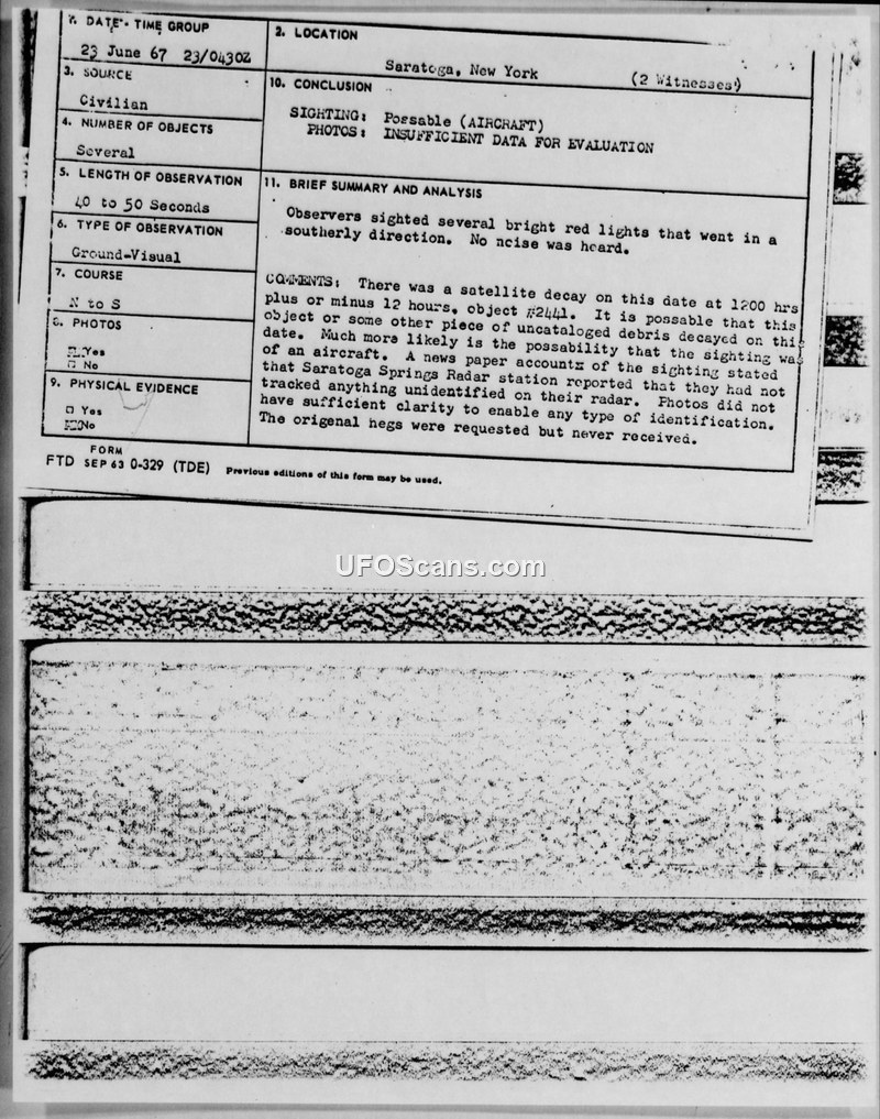 A collection of reports and correspondence regarding a June 1967 UFO sighting in Saratoga Springs, NY. The Air Force investigated the event but concluded that the provided photographic evidence was insufficient for identification.