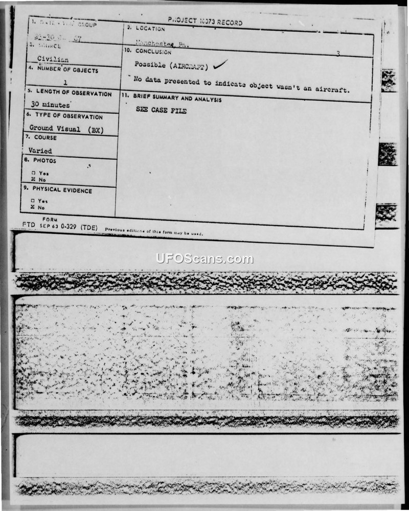 Project 10073 Record — UFO Observation, Manchester, Pennsylvania, June 1967