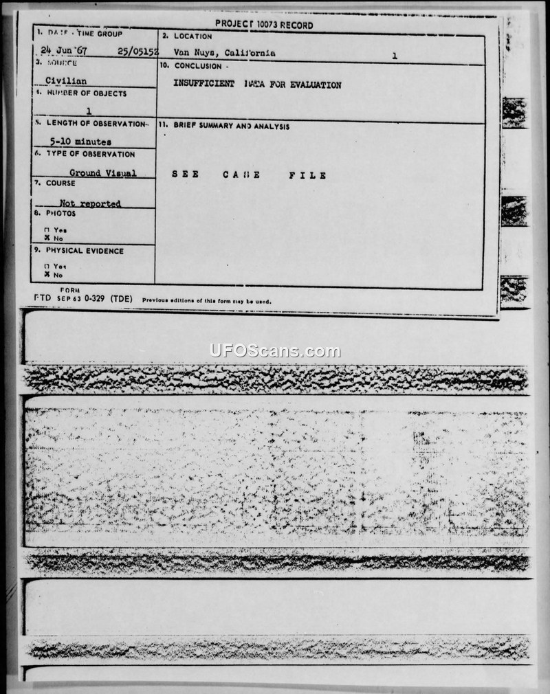 A 1967 UFO sighting report from Van Nuys, California, involving a disc-shaped object. The Air Force concluded there was insufficient data for a scientific evaluation.