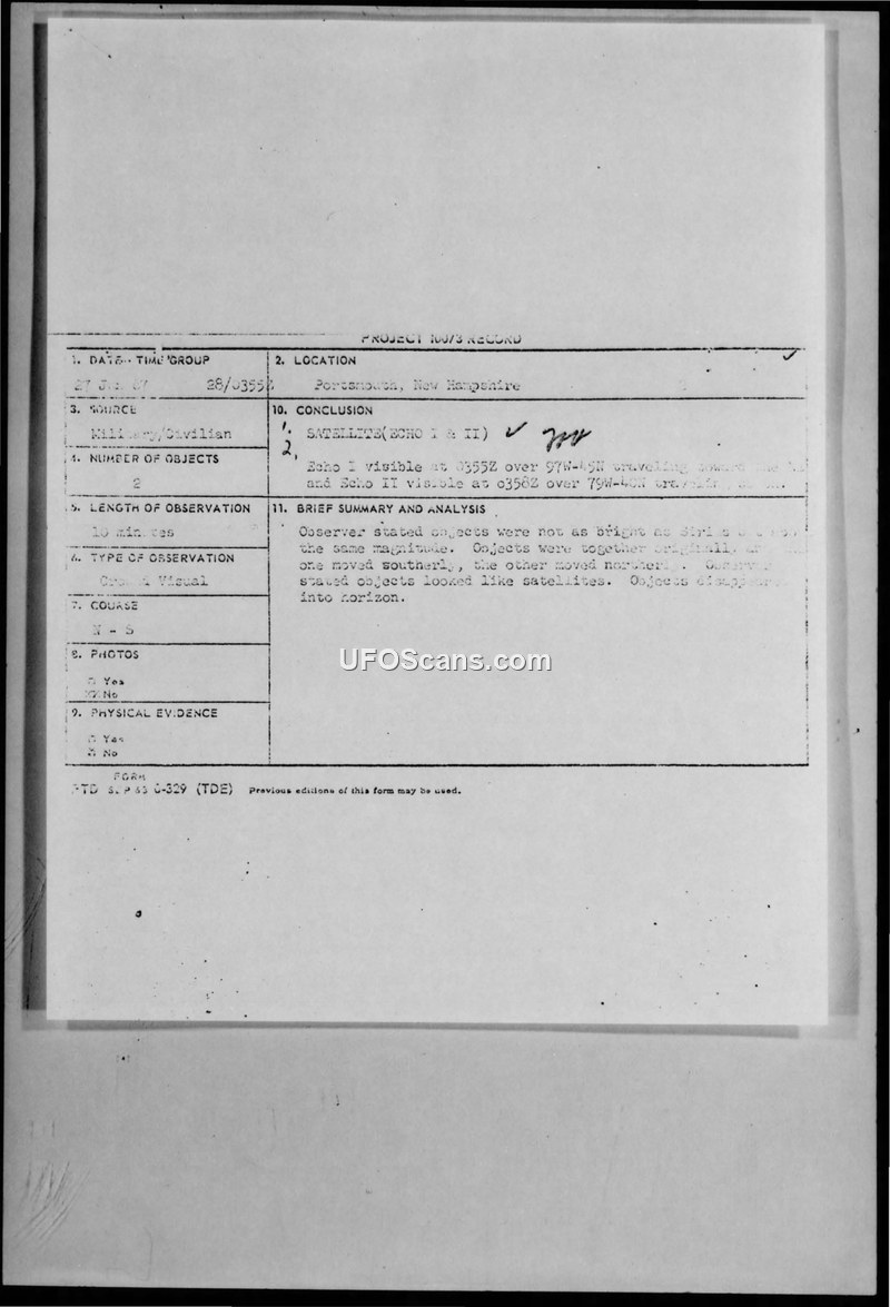 A USAF navigator reported two objects moving in opposite directions over Portsmouth, NH, on June 27, 1967. The Air Force officially identified the objects as the Echo I and Echo II satellites.