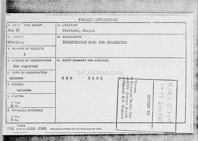 Project 10073 Record: UFO Observation, Portland, Oregon, June 1967