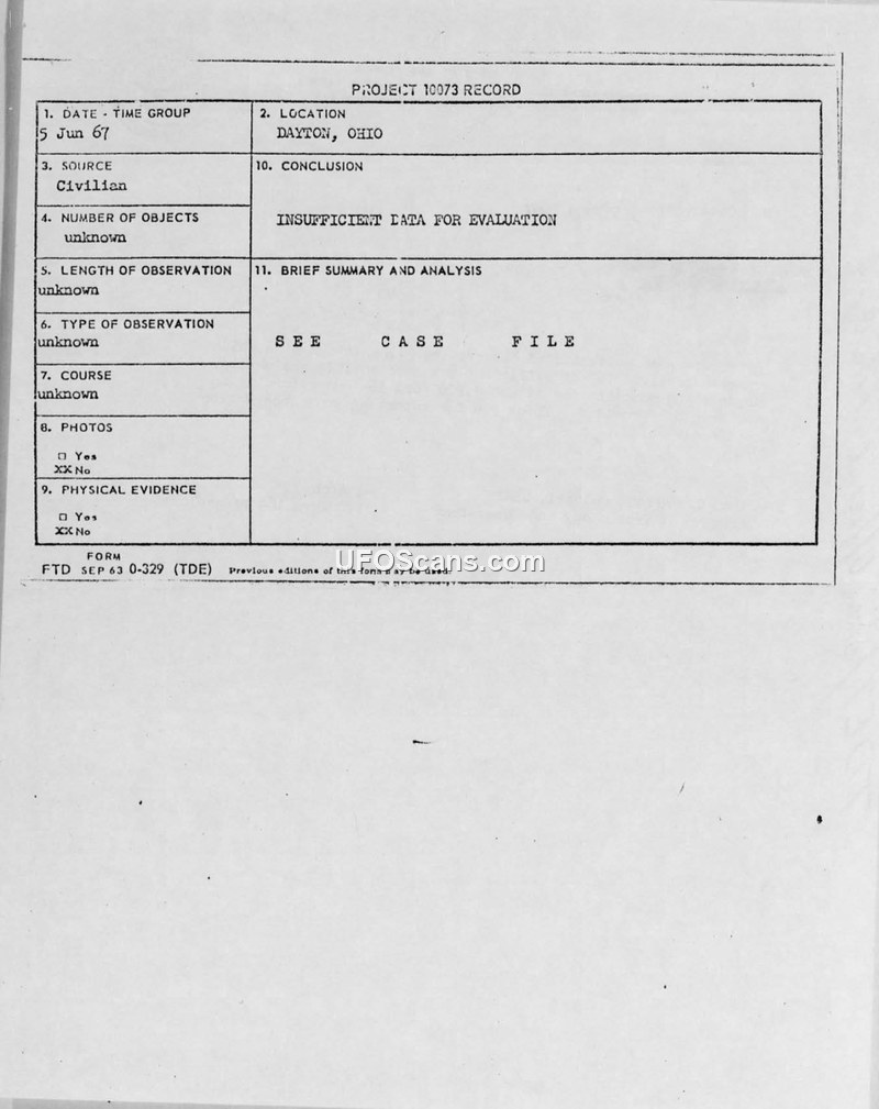 This document is a compilation of records from Project 10073, documenting a series of UFO sightings reported in Dayton, Ohio, during June 1967. The file contains multiple standardized U.S. Air Force Technical Information questionnaires completed by civilian witnesses, along with official correspondence from the Foreign Technology Division (FTD) at Wright-Patterson Air Force Base. The reports describe various sightings of objects in the night sky, often characterized as pulsating, changing color from red to green to white, and appearing fuzzy or blurred. Witnesses frequently compared the objects to stars or planets, though some noted unusual movement or behavior. The Air Force response to these reports was consistently that the information provided was insufficient for a scientific evaluation, and witnesses were requested to complete additional forms. Several entries in the record indicate that some of these sightings were later attributed to the Echo I satellite or the planet Mars. The documentation includes hand-drawn sketches by witnesses illustrating the motion and position of the objects relative to the horizon and stars, such as the Big Dipper. The records also highlight the administrative process of the FTD in handling these reports, including the use of duty officers to log sightings and the follow-up procedures for gathering more detailed data from observers.