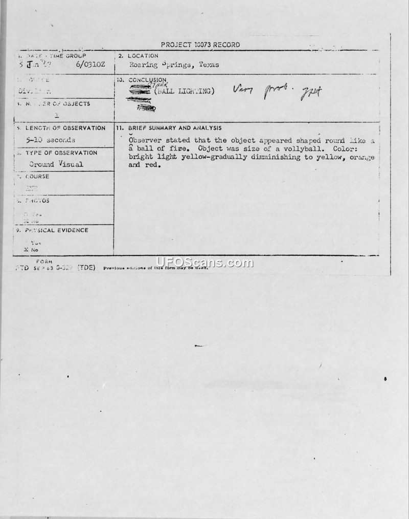 Project 10073 Record: Sighting Report - Roaring Springs, Texas, 5 June 1967