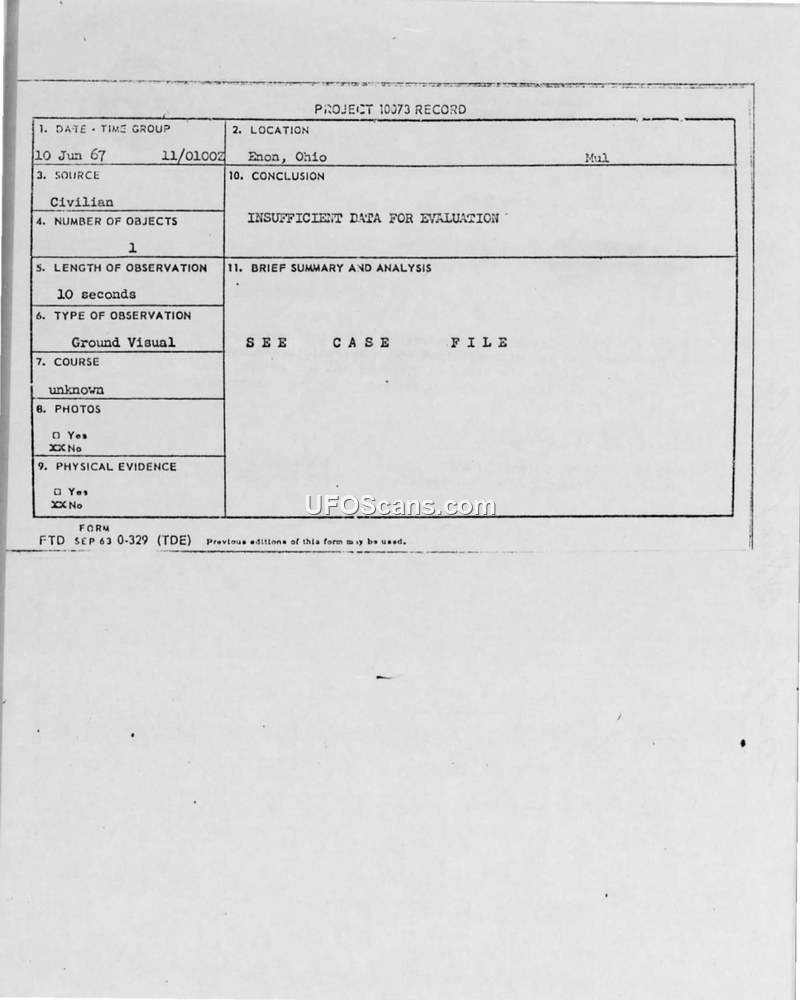 Project 10073 Record — Enon, Ohio, 10 June 1967