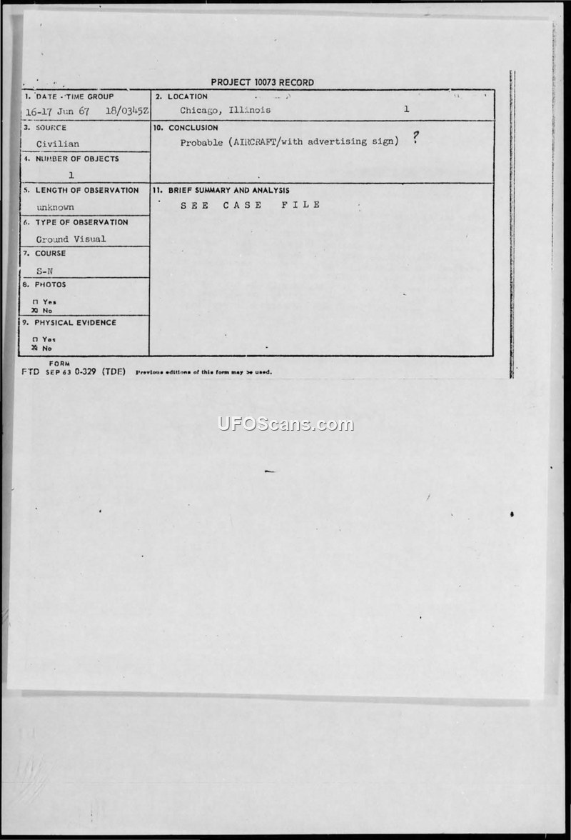 Project 10073 Record: UFO Observation, 16 or 17 June 1967