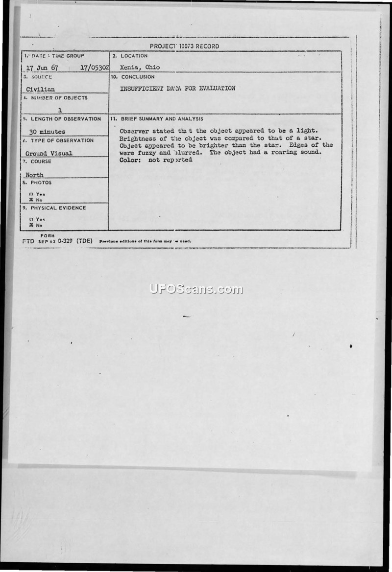 A civilian in Xenia, Ohio, reported a 30-minute sighting of a bright, roaring light on June 17, 1967. The Air Force determined the report contained insufficient data for a formal scientific evaluation.