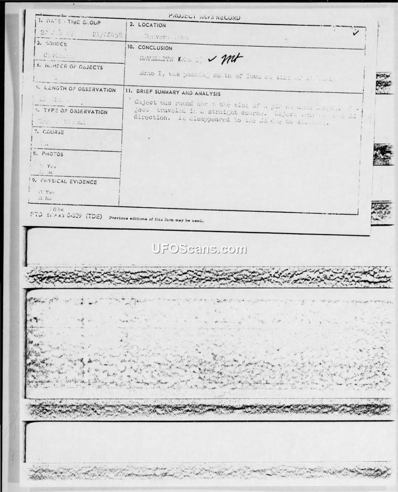A 1967 Air Force report details a 10-minute sighting of a white, pin-sized object by two farmers in Denver, Iowa. The investigating officer concluded the object was likely a high-flying aircraft or a satellite.