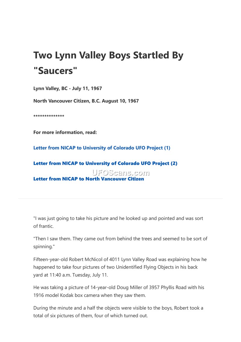 On July 11, 1967, at approximately 11:40 a.m., two youths, 15-year-old Robert McNicol and 14-year-old Doug Miller, observed two unidentified flying objects in the back yard of the McNicol residence at 4011 Lynn Valley Road in Lynn Valley, British Columbia. According to the account published in the North Vancouver Citizen on August 10, 1967, the boys were in the process of taking photographs with a 1916 model Kodak box camera when the objects appeared from behind trees. The witnesses described the objects as metallic-colored and observed them spinning. The objects reportedly hovered or stopped as if watching the boys before spinning away at high speed and disappearing. The encounter lasted for approximately one and a half minutes. During this time, Robert McNicol took six photographs, four of which were successful. The boys explicitly rejected the possibility that the objects were logging balloons from nearby Seymour Mountain, noting that the balloons were located to the east while they were facing west, and that the balloons were significantly larger than the objects they observed. Robert McNicol, who possessed a collection of literature regarding flying saucers, stated that his father intended to report the sighting to the United States Pentagon. The article also references related correspondence between NICAP and the University of Colorado UFO Project.