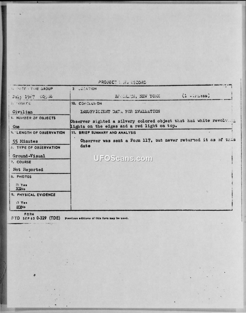 UFO Observation Report — Brooklyn, New York, July 1967