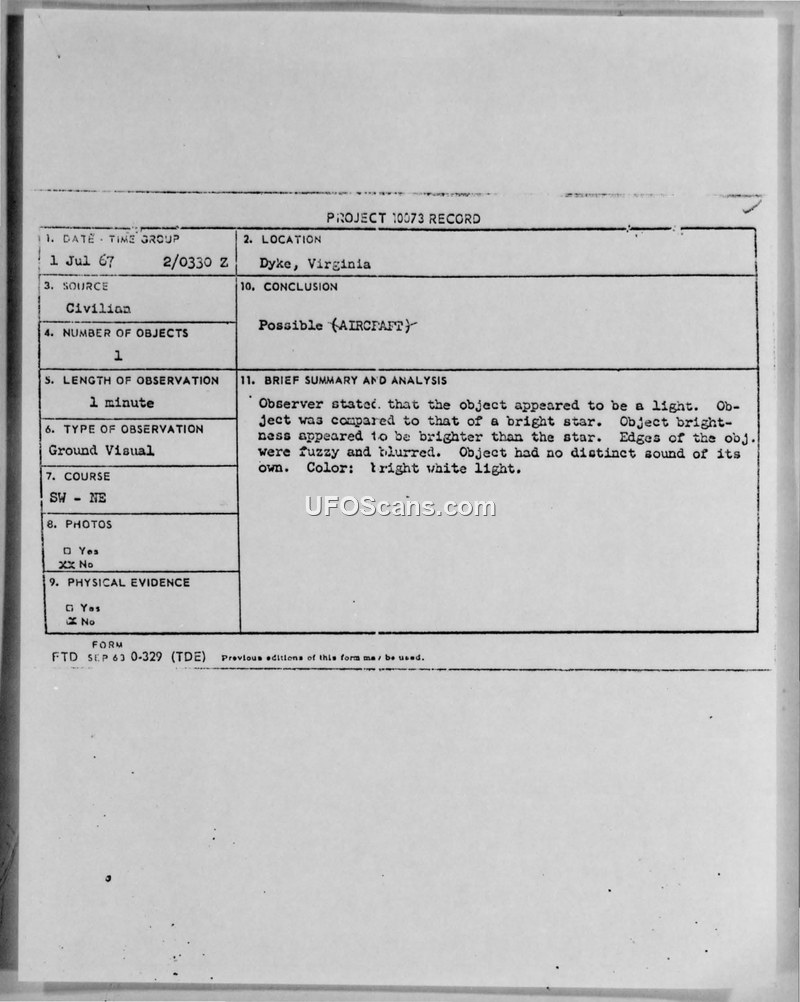 Project 10073 Record — Sighting near Dyke, Virginia, 1 July 1967