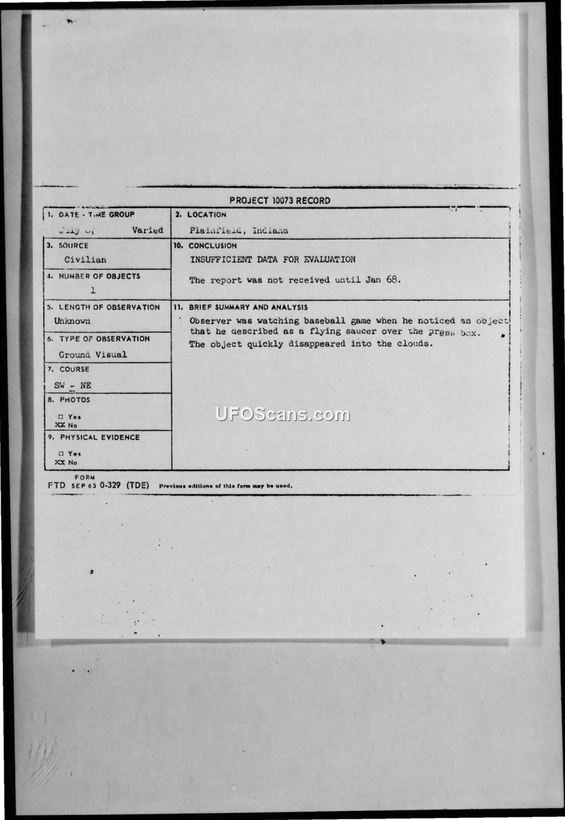 This document contains a Project 10073 record regarding a civilian sighting of an unidentified aerial object in Plainfield, Indiana, on July 2, 1967. The observer, while watching a baseball game at 3:00 PM, reported seeing a bright, metallic, flying saucer-shaped object moving from the southwest to the northeast. The observer noted the object moved at a speed comparable to a propeller airplane, made no sound, and eventually disappeared into the clouds. The report was not submitted to the authorities until January 1968, resulting in an official conclusion of insufficient data for evaluation. The file also includes a letter dated January 6, 1968, addressed to Project Blue Book at Wright-Patterson AFB, in which a correspondent mentions additional sightings, including an account involving a Mr. Melheim and an individual named Ilander, who allegedly observed a saucer-shaped object at night that appeared to have a floodlight turned on.