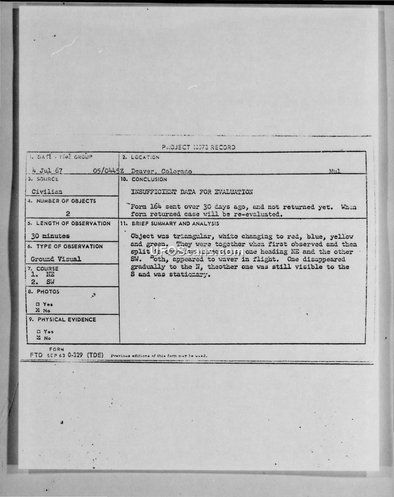 A student in Denver reported two triangular, multi-colored objects on July 4, 1967. The Air Force determined the report lacked sufficient data for a scientific evaluation.