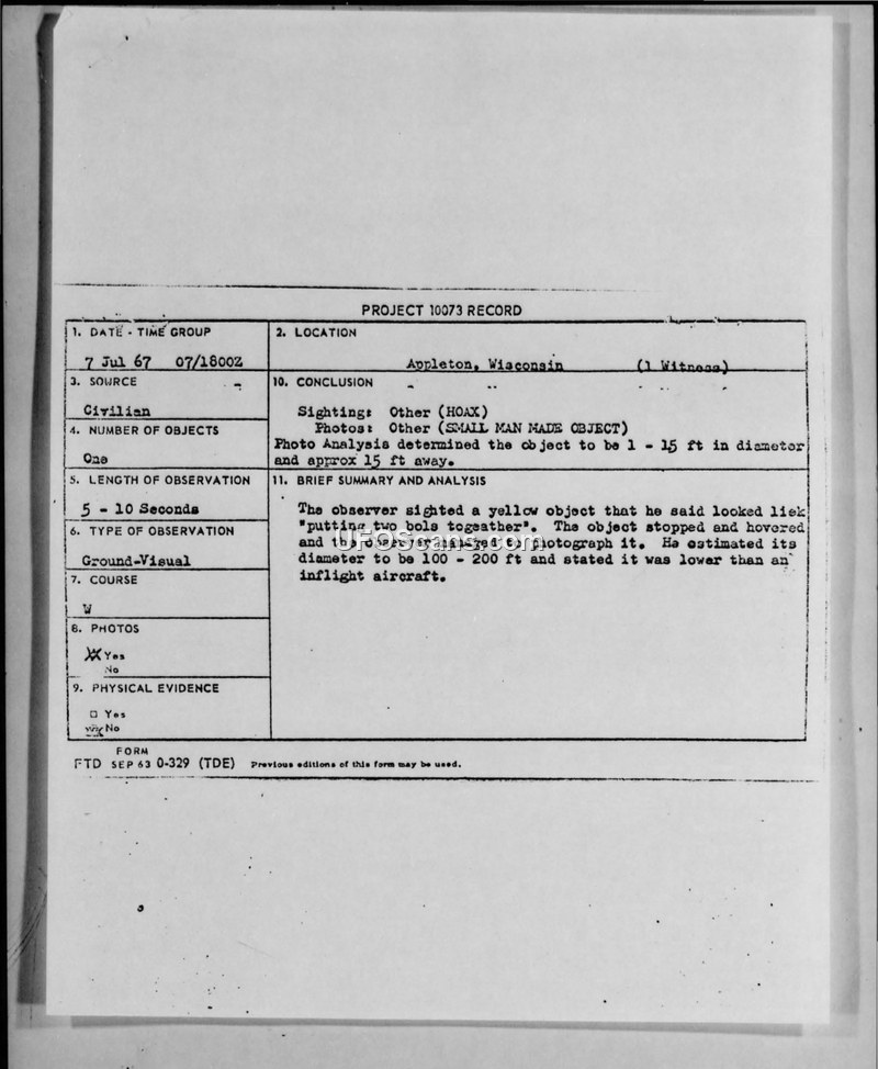 A 14-year-old reported a UFO sighting in Appleton, Wisconsin, in 1967, providing a photograph. Air Force photo analysis concluded the object was a small, nearby man-made object rather than a large, distant craft.