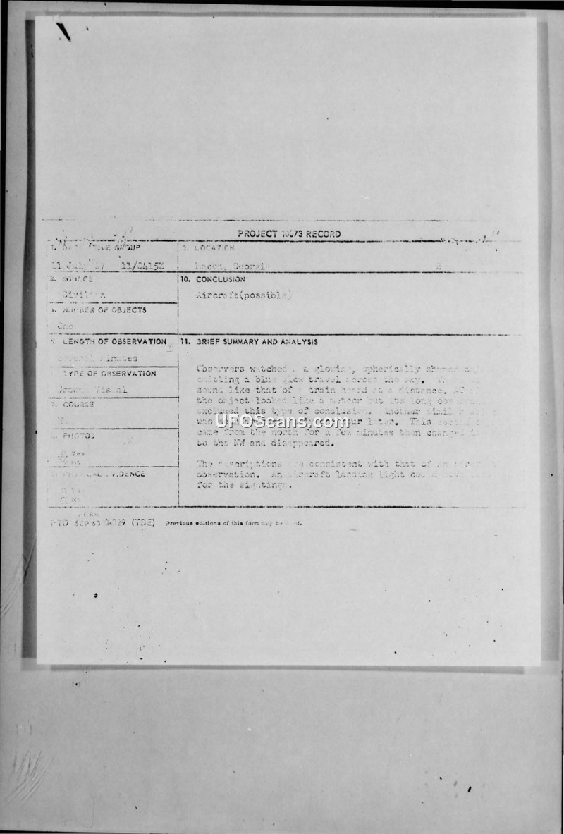 This document collection details a UFO sighting reported on 11 July 1967 in Macon, Georgia. The primary witness, a 28-year-old male, observed a spherical, bluish-white object that initially appeared like a falling star before leveling off and remaining stationary. The witness described the object as having a rotating light on the bottom and emitting a sound similar to a distant train. His wife, who also observed the object, described it as having a 'roar like a jet airplane.' The initial military investigation classified the event as 'possible aircraft.' This conclusion was met with significant internal debate. Dr. J. Allen Hynek, a consultant for the Air Force, criticized the 'possible aircraft' evaluation, citing the absence of aircraft in the vicinity at the time of the sightings (0015 and 0145 hours) and noting that the 'blue-white glow' description did not align with standard aircraft characteristics. He suggested that 'possible unknown' should be included as an evaluation. In response, 2d Lt. Carmon L. Marano defended the original assessment, arguing that the witness's description of the object's behavior and sound was consistent with an aircraft, and that the lack of recorded flight data at Warner Robins AFB did not preclude the presence of aircraft from other airports, such as Atlanta. The document includes correspondence between military personnel and Dr. Hynek, reflecting the ongoing tension between field investigators and scientific consultants regarding the classification of UAP reports. The investigation was ultimately considered complete, with no definitive explanation determined.