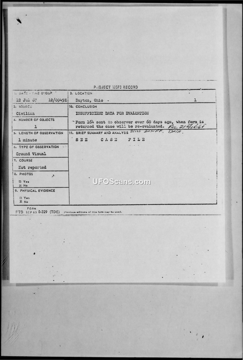 Project 10073 Record — Multiple Sightings, Dayton, Ohio, July-October 1967