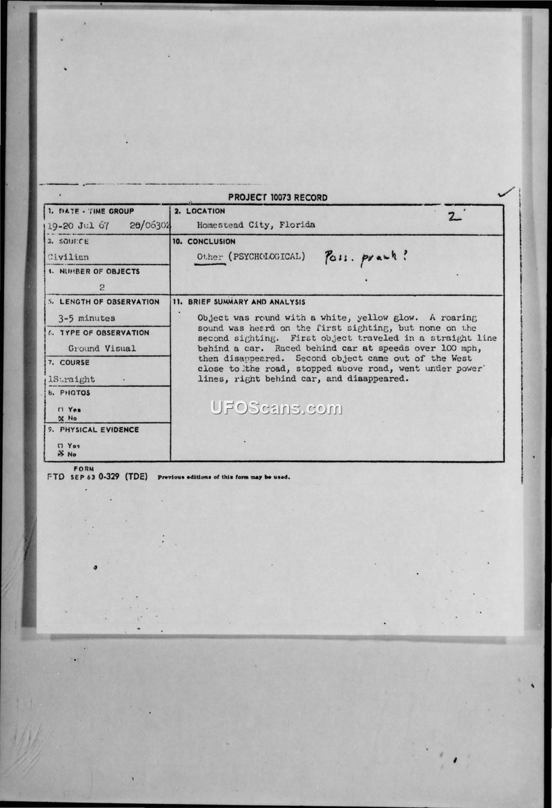 UFO Report of 20 July 1967 - Homestead Air Force Base
