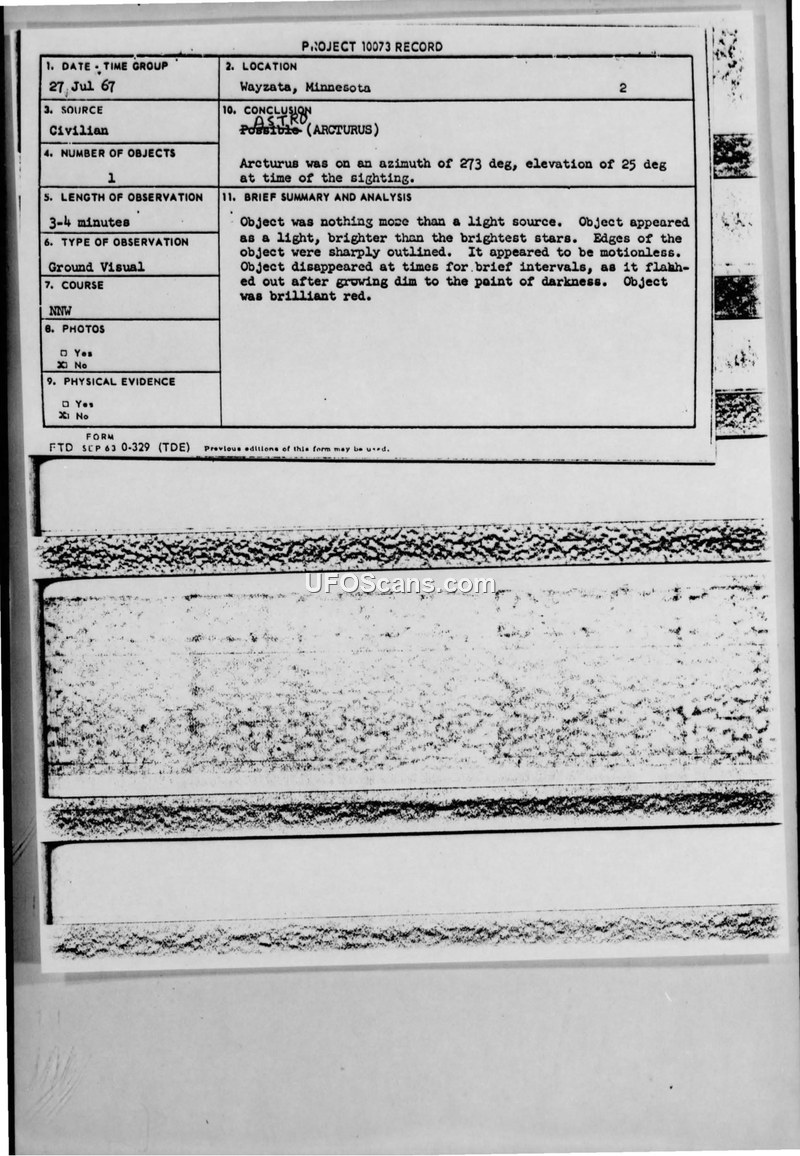 A 1967 UFO sighting in Wayzata, Minnesota, was investigated by Project Blue Book. The object was officially identified as the star Arcturus.