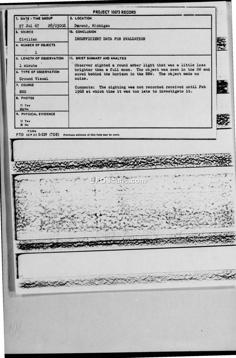 A civilian reported a slow-moving, amber light in Durand, Michigan, on July 27, 1967. The report was filed in February 1968, leading the Air Force to conclude there was insufficient data for evaluation.