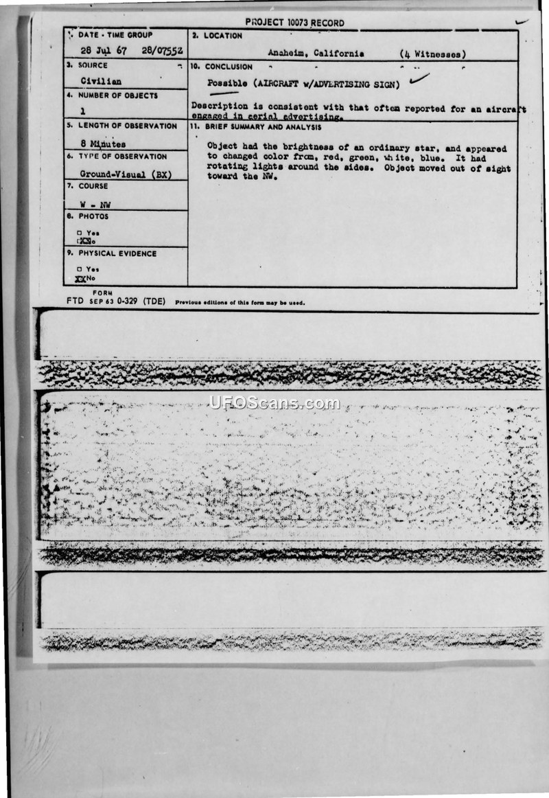 A 13-year-old witness in Anaheim, California, reported a color-changing aerial object on July 28, 1967. The Air Force concluded the sighting was likely an aircraft engaged in aerial advertising.