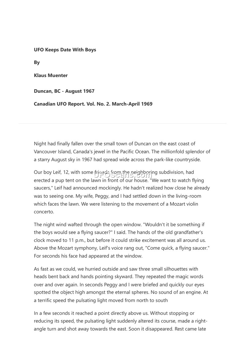 In August 1967, in the town of Duncan on Vancouver Island, Canada, author Klaus Muenter and his wife, Peggy, witnessed an unidentified aerial phenomenon. Their 12-year-old son, Leif, and his friends had set up a tent on the lawn with the intention of watching for flying saucers. At approximately 11 p.m., Leif alerted his parents to an object in the sky. Upon exiting their home, the witnesses observed a pulsating light moving at a high speed from north to south. The object, which made no engine noise, reached a point directly above the observers before executing a sudden right-angle turn and accelerating toward the east, where it disappeared. The author notes that he observed the sky again the following night with binoculars, during which he saw a plane and a satellite, but the pulsating light appeared again, moving too fast to be focused upon. The author concludes that this experience provided him with tangible proof of the existence of unexplainable objects in the sky, reinforcing his belief that humanity is not alone in the universe.