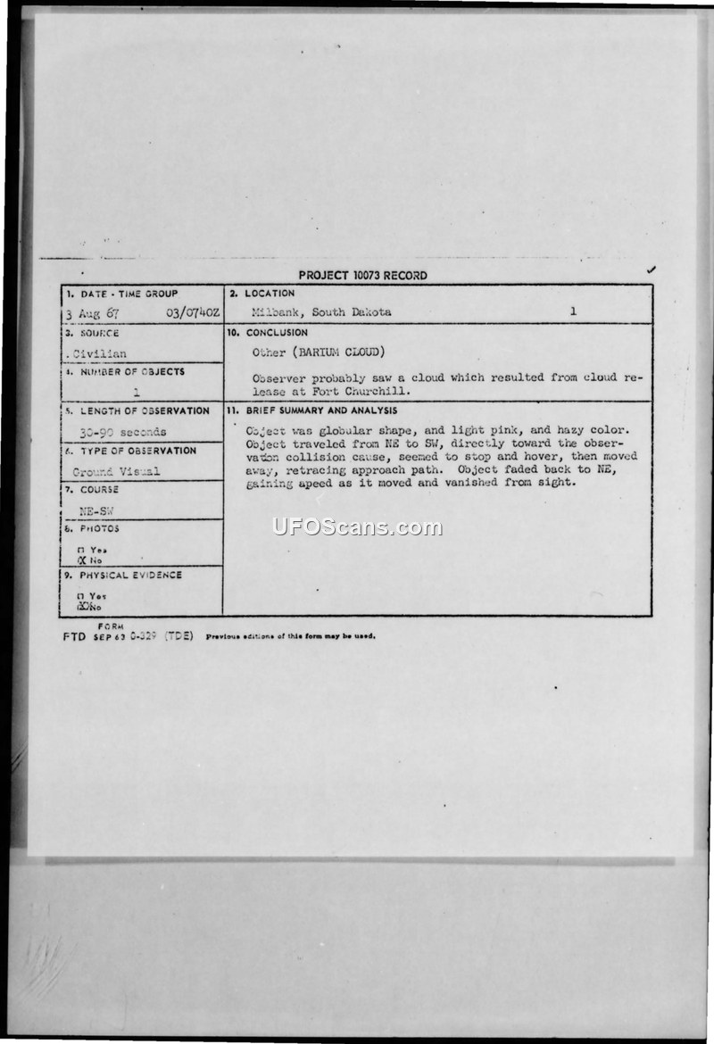 Project 10073 Record: Sighting Report - Milbank, South Dakota, 3 August 1967