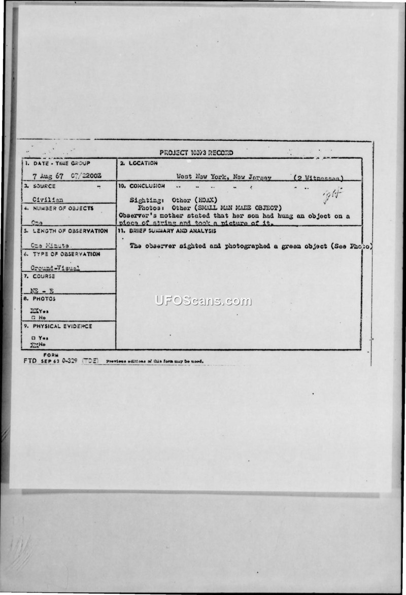 This document details the investigation of a UFO sighting reported in West New York, New Jersey, on August 7, 1967. The initial report involved a civilian who claimed to have observed and photographed a green object for approximately one minute at an estimated altitude of 150 yards. The Aerial Phenomena Office (Project Blue Book) initiated an investigation, requesting original photographs from the observer to perform a scientific analysis. The observer, however, only provided copies, which the Air Force determined were inadequate for precise measurement due to processing defects and inaccurate borders. Following a formal inquiry by the West New York Police Department, it was determined that the incident was a hoax. The observer's mother confirmed that her 13-year-old son had hung an object on a piece of string in their backyard, photographed it, and submitted the images to a science fiction magazine to see how far the deception would go. The mother expressed regret for the incident, and the police department formally notified the Air Force that the matter was a hoax. The Air Force subsequently closed the case file, confirming the evaluation based on the police report.