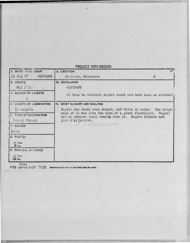 Project 10073 Record — Baudette, Minnesota, 11 August 1967