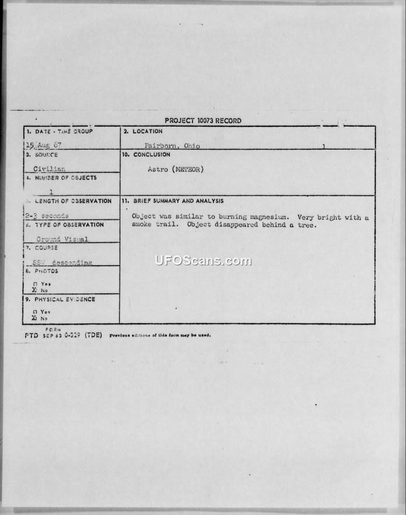 Project 10073 Record — Fairborn, Ohio, 15 August 1967
