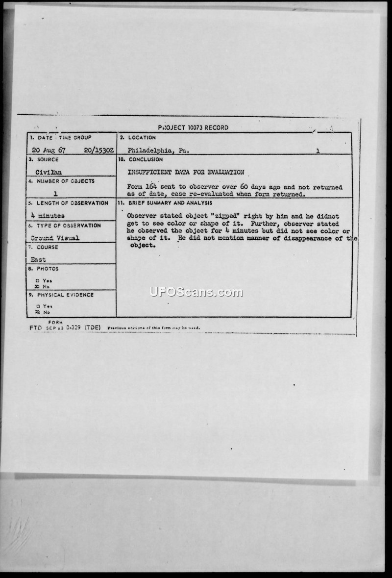 Project 10073 Record — Philadelphia, Pa. — 20 Aug 67