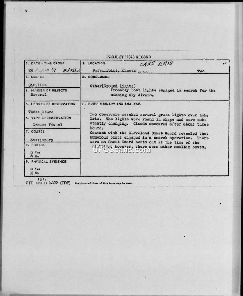 Project 10073 Record: UFO Report - Lake Erie, 29 August 1967