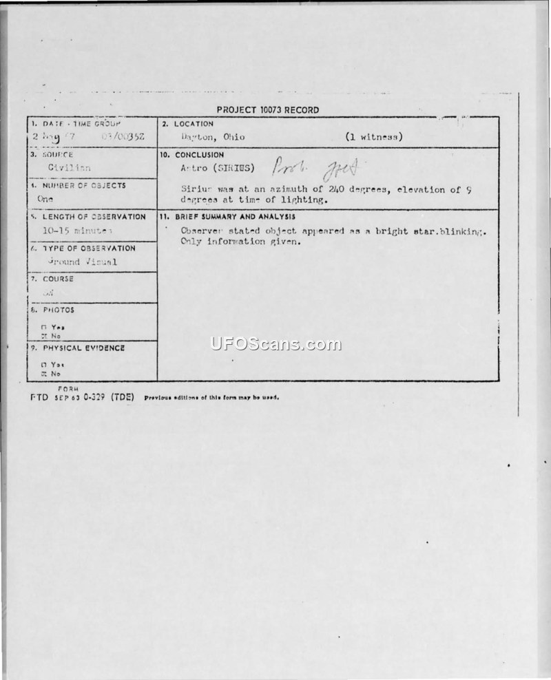 This document contains a series of Project 10073 records and associated correspondence regarding multiple UFO sightings reported in the Dayton, Ohio area during August 1967. The records document reports from civilian witnesses who observed unidentified objects, often described as star-like, blinking, or flashing lights. Specific details vary by report; some witnesses noted colors such as red, white, blue, or a green circle around the object. The duration of these sightings typically ranged from 2 to 15 minutes. In several instances, the Foreign Technology Division (FTD) at Wright-Patterson Air Force Base sent FTD Form 164 questionnaires to the witnesses to gather more scientific data. Many of these cases were ultimately marked as 'Insufficient Data for Evaluation' because the forms were not returned. Other cases were tentatively categorized as 'Possible' or 'Probable' aircraft. The documentation includes internal memos for the record, correspondence with witnesses, and technical information questionnaires completed by the observers. One memo notes that the FTD contacted Wright-Patterson AFB Dispatcher and the F.A.A. to check for aircraft activity during a specific sighting, finding no unusual activity. Another memo requests meteorological data for the Dayton area to assist in the evaluation. The records reflect the standard operating procedure for the Air Force's investigation of UAP reports during this period, emphasizing the need for structured data collection via standardized forms.
