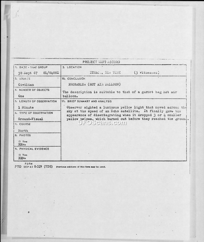 Project 10073 Record — Ithaca, New York, 30 September 1967