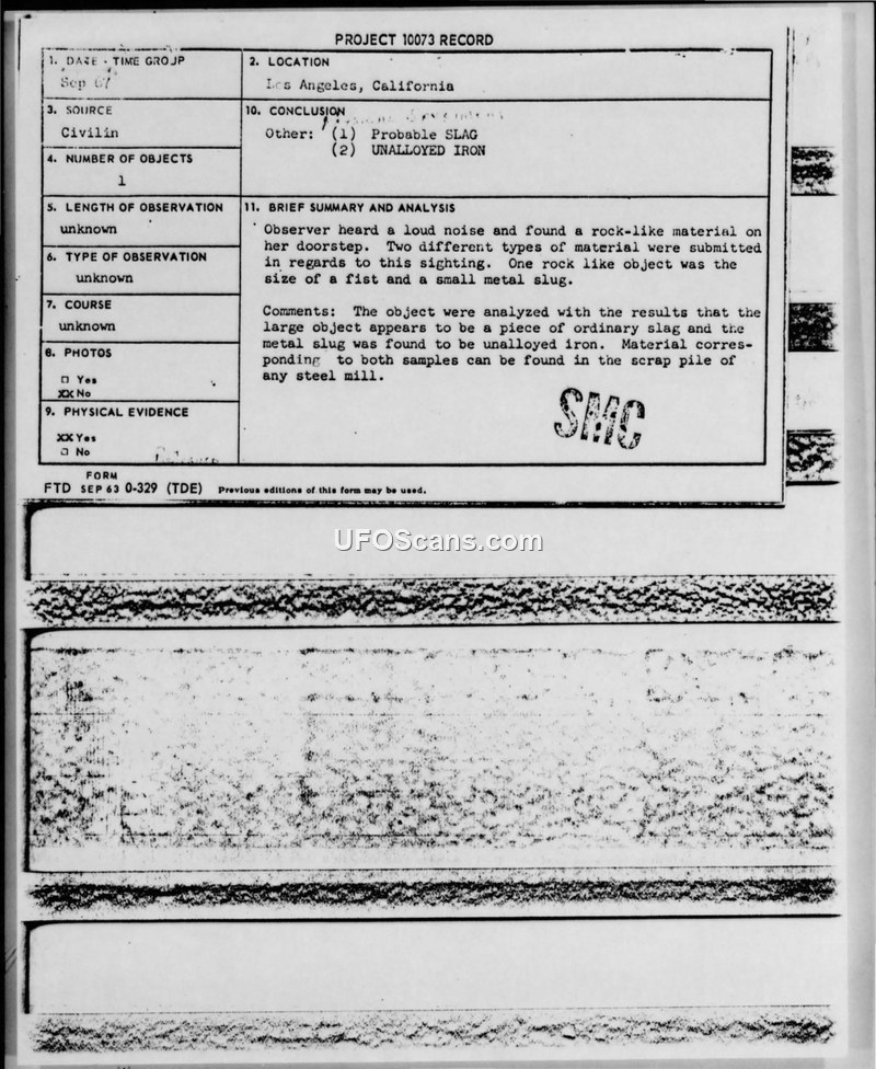 In September 1967, a resident in Hawthorne, California, reported hearing a loud noise and discovering a rock-like object on her doorstep. The Los Angeles Police Department forwarded the object, along with a small metal slug, to the 6592nd Support Group at the Los Angeles Air Force Station. The Air Force initiated an investigation to determine if the material was related to a recent missile shot or space vehicle reentry. The objects were subsequently sent to the Foreign Technology Division at Wright-Patterson Air Force Base for analysis. The Air Force Materials Laboratory conducted a spectrographic analysis and X-ray diffraction on the samples. The analysis concluded that the large rock-like object was ordinary slag, and the metal slug was unalloyed iron, specifically Type 1020 steel. Experts, including Mr. Huston of the Materials Lab and Lt. Marley, a metallurgist, determined that the samples were not part of a rocket body or space vehicle and were unlikely to be meteorites due to insufficient nickel content. The findings were communicated to the 6592nd Support Group, and the specimens were slated for return to the owner.