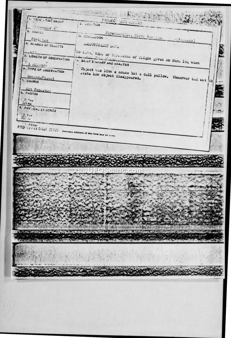 A 12-year-old witness reported a dull yellow, house-shaped object near Fayetteville, NC, in September 1967. The Air Force determined the report provided insufficient data for a scientific investigation.