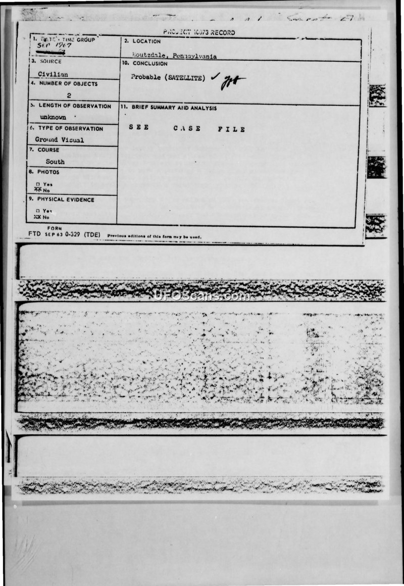 A civilian in Houtzdale, Pennsylvania, reported multiple UFO sightings in 1967 and submitted photographic evidence to the Air Force. The Air Force evaluated the reports and photographs, concluding that the sightings were conventional phenomena such as satellites and cloud releases, and returned the materials due to poor quality.