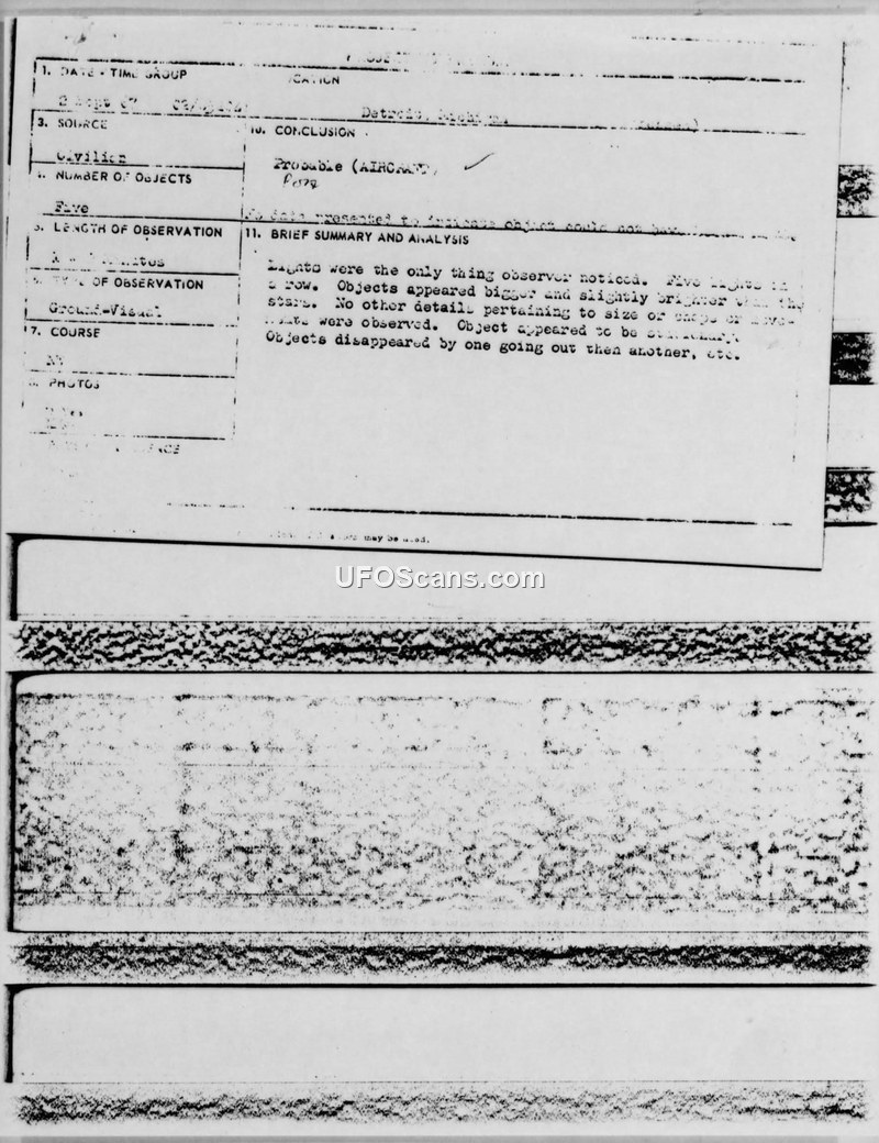 The Foreign Technology Division investigated a report of lights over Detroit. The 509th Bombardment Wing confirmed that two aircraft were on a refueling mission in AR-206, exiting the area at approximately 0500.